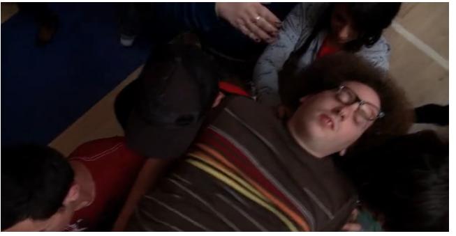 Gleekers headquarters, and Artie is explaining to the other stunned Gleekers that there's actually no rule against him playing - and that Britney Spears gave him the courage to ask Coach Beiste if he and Finn could join the team.